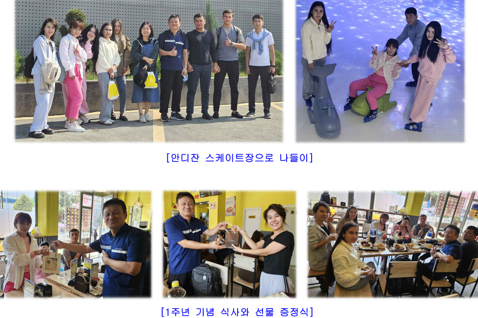 2025년 10월 1일, 미래인재센터 1주년 기념으로 학생들과 함께 안디잔이라는 도시에 있는 스케이트장으로 여행을 갔습니다. 또한 1년 동안 쉬지 않고 계속 센터에서 공부하고 있는 페루자와 라일러혼에게 감사 선물을 증정했습니다. 한국 식당에서 식사도 하며 즐거운 하루를 보냈습니다.